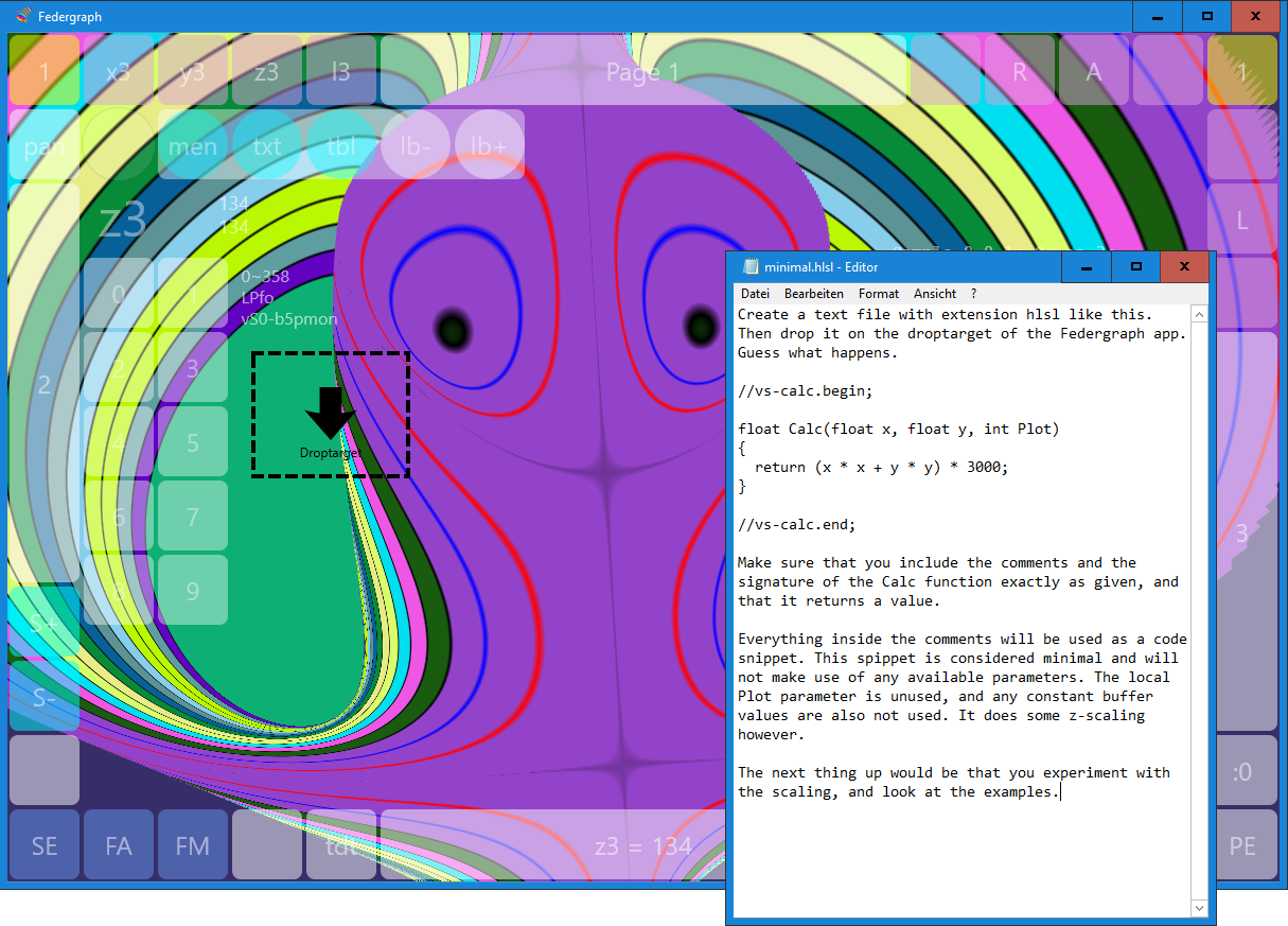 Federgraph takes a different approach by slicing the field - nothing new, often used. Take a plane and cut through space with the plane. Any plane will do. Now you can show floating-point values over that plane, in the same way you normally plot values over a line.